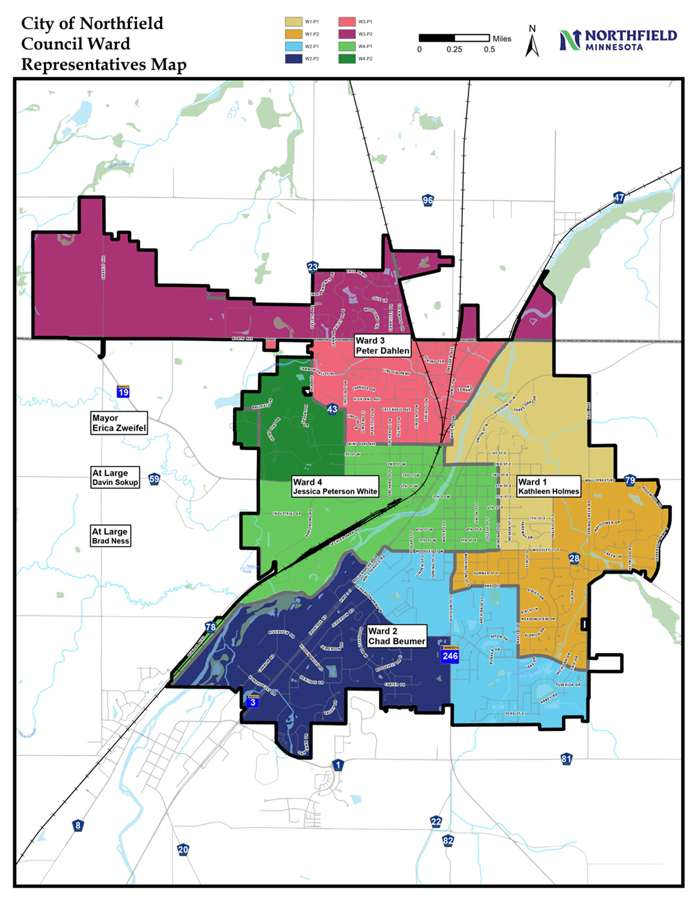 Please email me with your comments, requests, hopes for Northfield. I am your voice on the Council and if you live in the Third Ward, I directly represent you on the Council.  The Third Ward is the northwest area of Northfield; the southern border is St Olaf Ave, the eastern border is essentially Highway 3, the western border extends all the way to Hospital and Benedictine Center, and the northern boundary extends into Dakota County (see the light and dark pink areas on the map to the left).